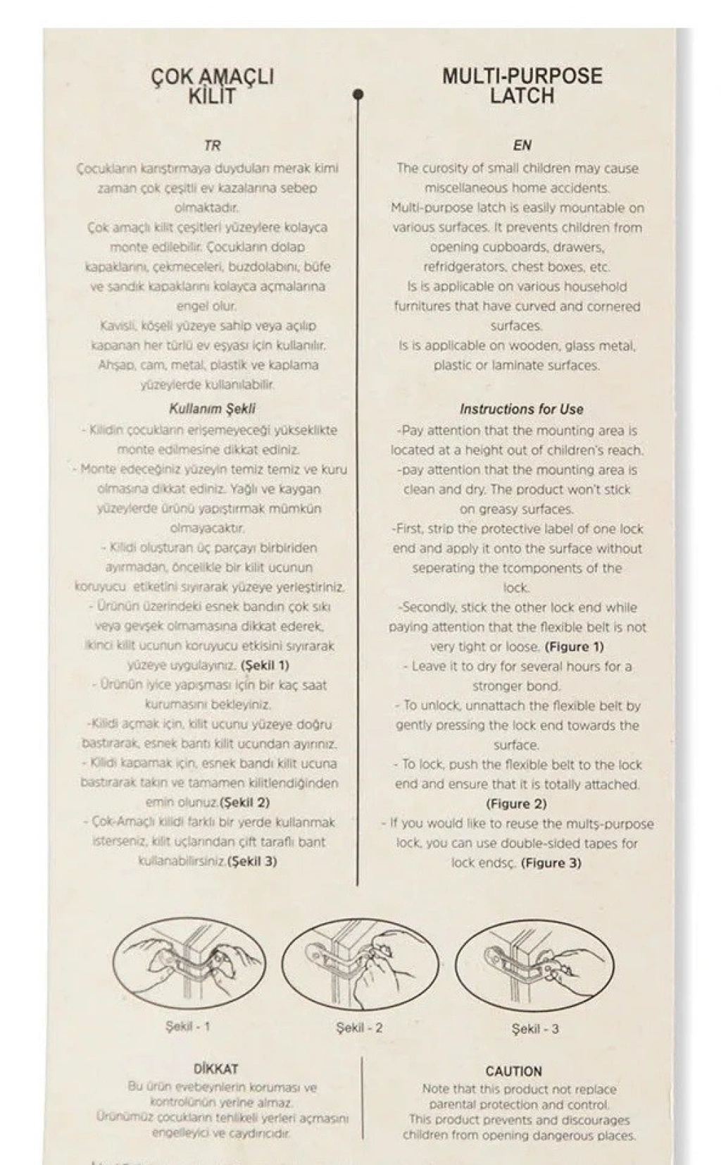 Çok Amaçlı Koruma Kilidi - 4 Adet ile Çocukların istemediğiniz dolap kapaklarına ulaşmasını önlemek ve tehlikeden korunabilmeleri sağlanmaktadır.