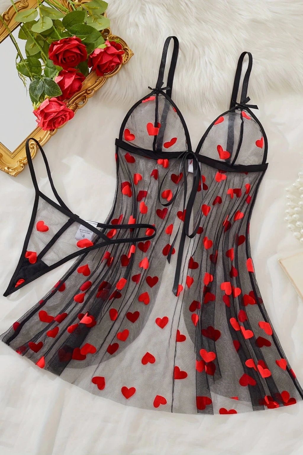 Kalp Desenli Siyah Transparan Tül Gecelik Tm1378