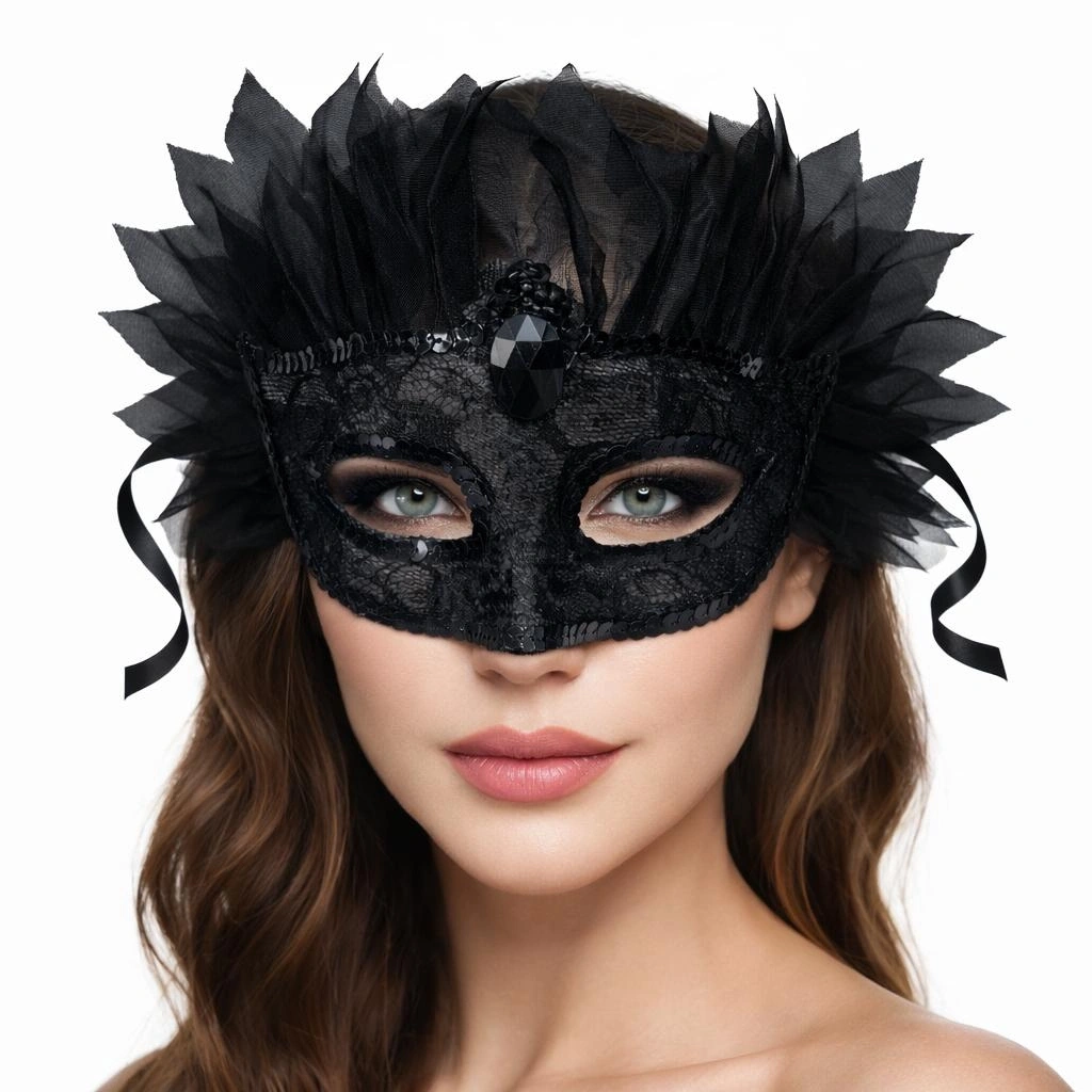 Gizemli ve zarif bir görünüm için tasarlanan siyah taşlı tüllü Venedik maskesi, özel davetlerinizde stilinizi ön plana çıkarır. Ön kısmındaki büyük taş detayı ve etrafındaki yoğun tül saçak tasarımı ile premium bir görünüm sunar.